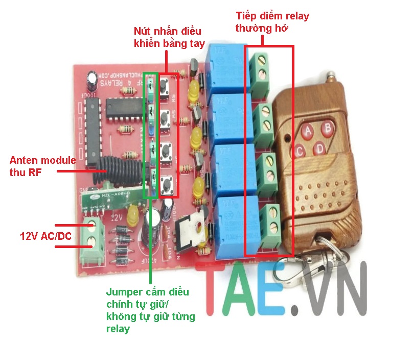 - Ngõ ra tiếp điểm relay: NO (thường hở)