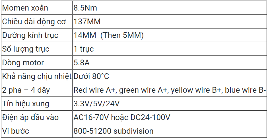 Thông số kỹ thuật Combo Hybrid Servo Driver HBS86H + Motor 86HSE8.5N:
