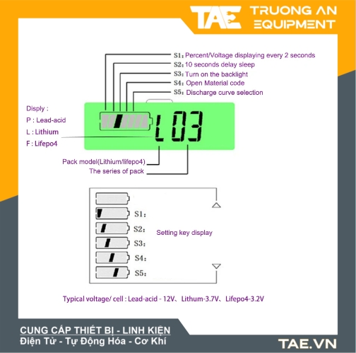 - Chức năng: Đo và hiển thị mức pin thông qua hiển thị % pin hoặc điện áp còn lại của pin - điều chỉnh bằng nút nhấn