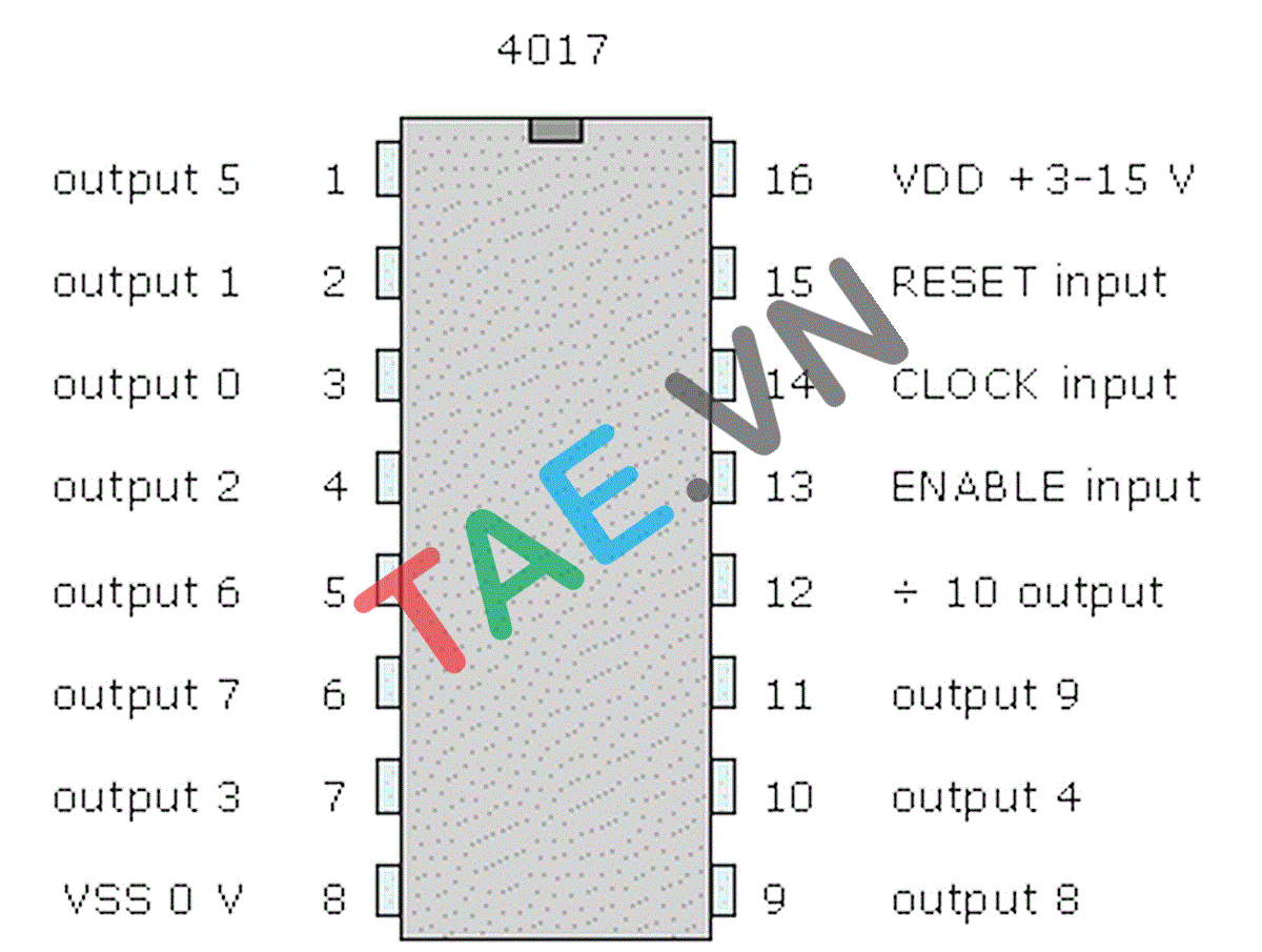 - Số ngõ ra: 10 ngõ ra riêng biệt tuần tự là 3 , 2, 4, 7, 10, 1, 5, 6, 9, 11