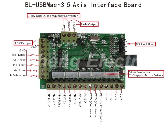 Mạch CNC BOB MACH3 USB V2 có khả năng điều khiển 5 động cơ bước cùng lúc qua các ngõ cấp xung-chiều X, Y, Z, A, B, mạch còn có khả năng nhận các ngõ vào tín hiệu IN1, IN2, IN3, IN4, IN5 và xuất tín hiệu qua các ngõ ra OUT1, OUT2, OUT3, OUT4, các ngõ tín hiệu vào ra này điều được cách ly qua Opto và IC đệm nên rất an toàn cho board mạch, ngoài ra mạch còn có ngõ ra xuất xung PWM để điều khiển tốc độ Spindle.