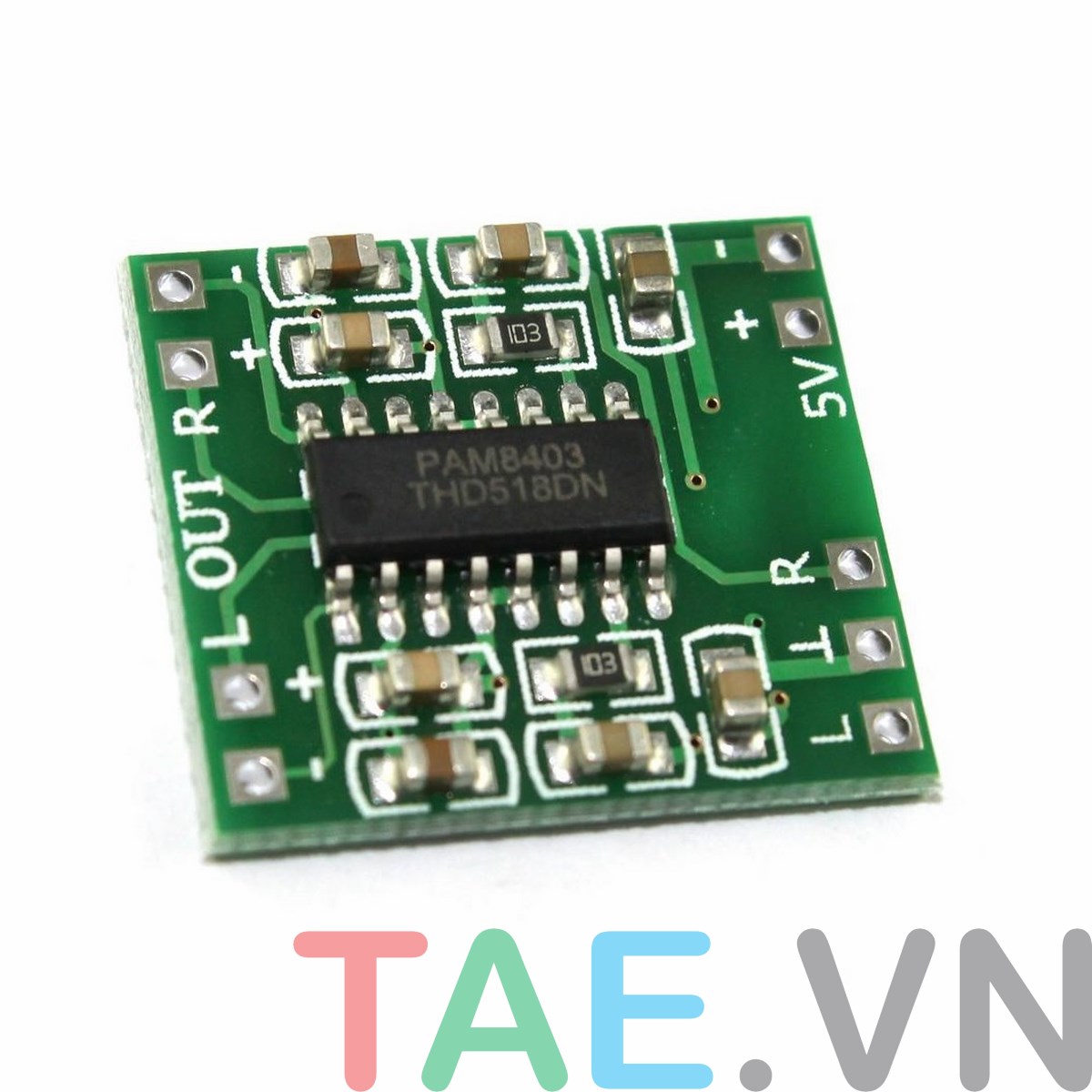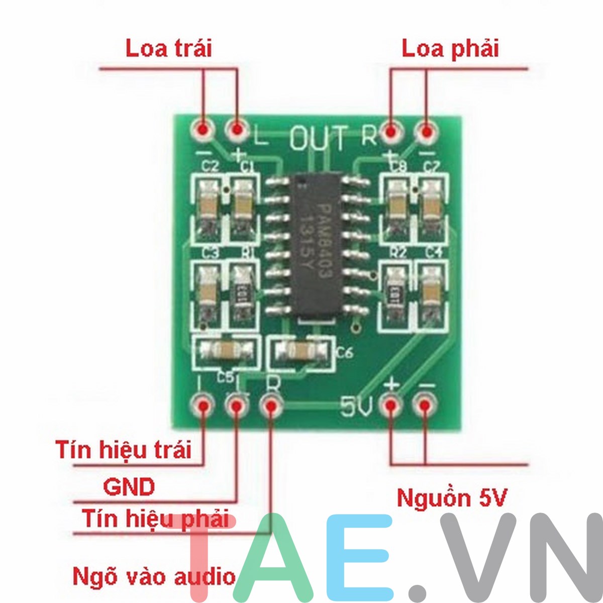 - Mạch sử dụng IC PAM8403 được thiết kế Class-D được tích hợp bộ lọc L-C, module được thiết kế nhỏ gọn giúp thiết kế những ứng dụng nhỏ gọn và có thể mang đi.