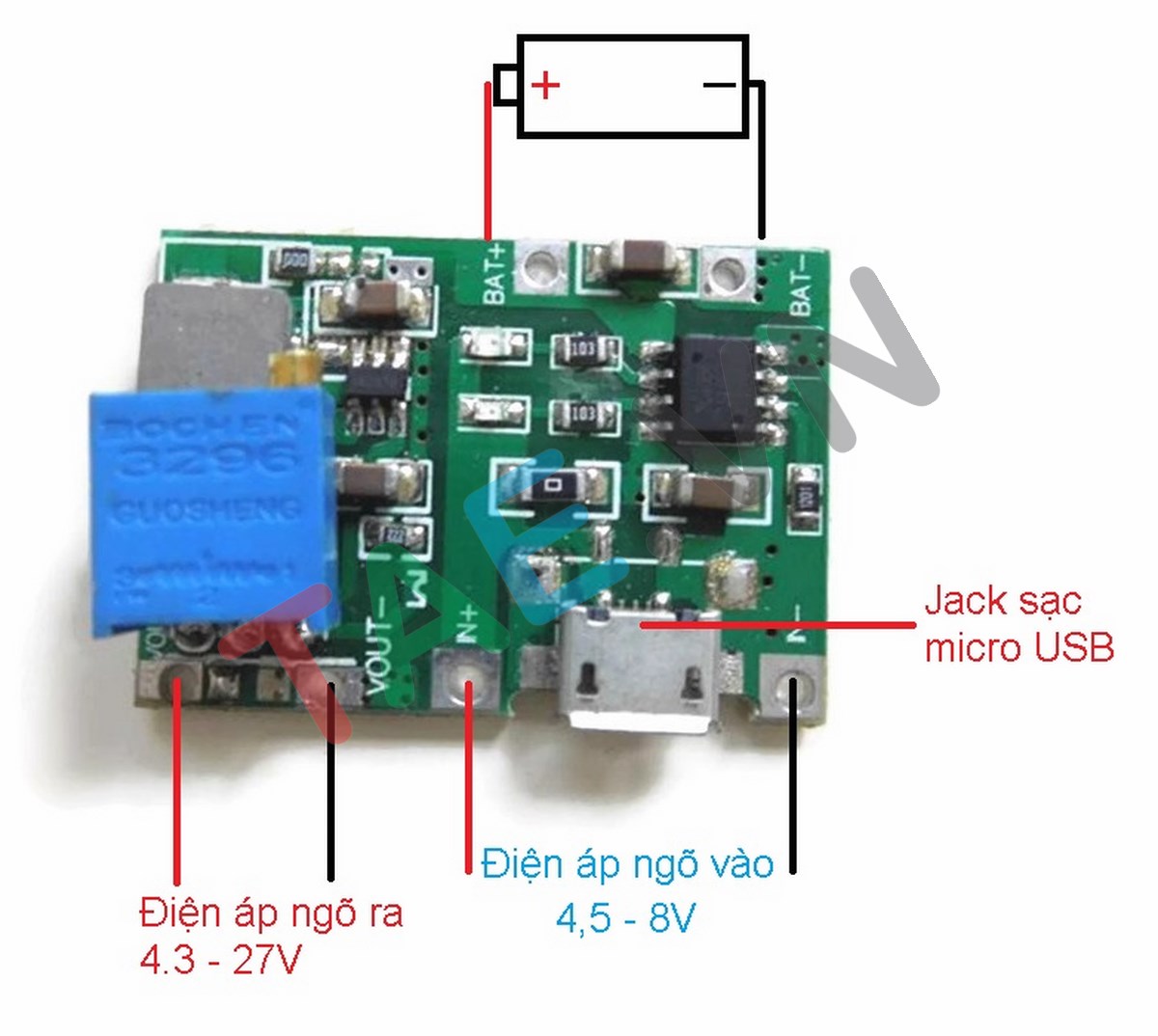 - Mạch chưa tích hợp biến trở, lắp thêm 1 biến trở tinh chỉnh 10K để điều chỉnh điện áp ngõ ra.
