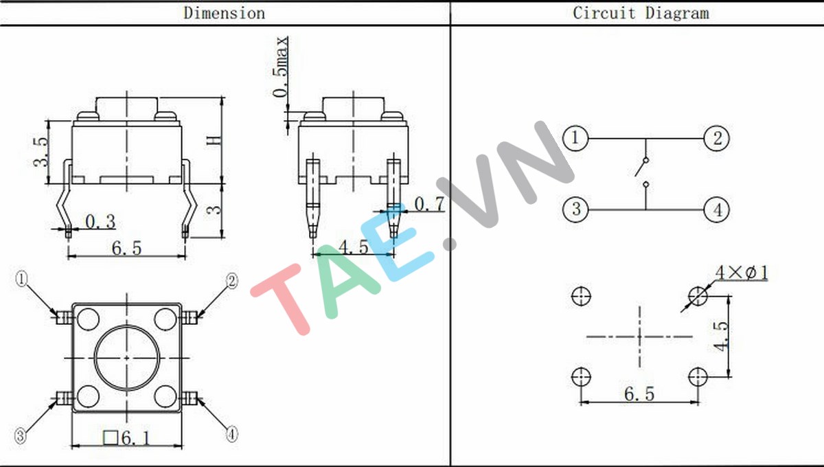 Thông số kỹ thuật Nút nhấn 4 chân đầu tròn 1 bịch (10 con)